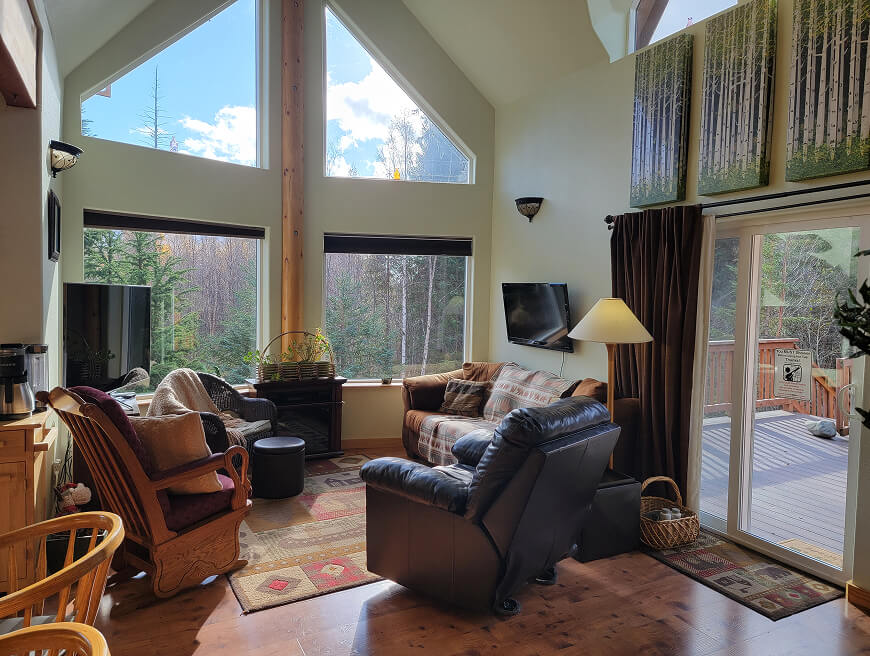 Inside, the chalet feels airy and inviting. Sunlight pours through tall windows, filling the open living space with warmth. The kitchen is fully stocked and ready for long breakfasts or easy dinners after a day of exploring. A winding staircase leads to a cozy loft, a favorite hideaway for kids and dreamers alike.
